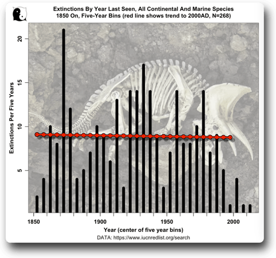 “Aqui está a história de todas as extinções continentais e marinhas da Lista Vermelha para as quais a Lista Vermelha tem uma data para a extinção. Os dados iniciais são escassos e, como resultado, contêm poucas extinções por ano, por isso mostrei o período de 1850 em diante, quando ocorriam muito mais extinções por ano, e para o qual temos dados muito melhores.