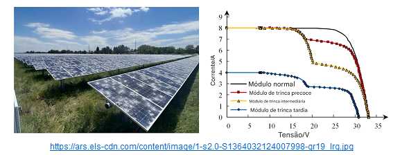 Danos a módulos fotovoltaicos causados ​​por granizo em Nebraska, EUA (esquerda), e as características IV de módulos fotovoltaicos rachados (direita). As linhas representam a progressão do desempenho de um módulo ao longo do tempo: ‘normal’ refere-se a um módulo sem rachaduras, ‘inicial’ refere-se a 3 meses, ‘intermediário’ refere-se a 6 meses e ‘tardio’ refere-se a 12 meses após a ocorrência da rachadura. Foto cortesia da GenPro Energy Solutions.