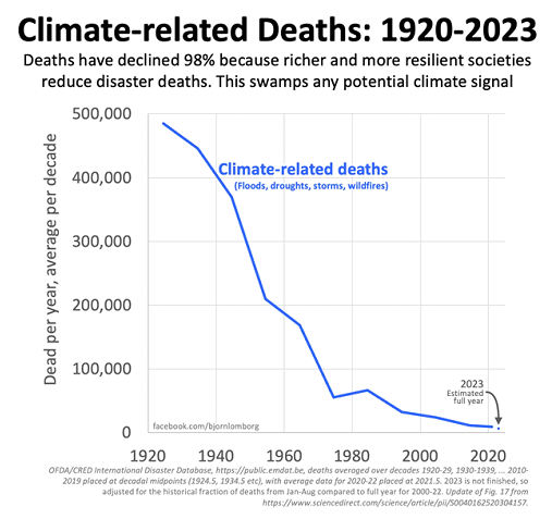 A principal razão pela qual os economistas do clima esperam que os efeitos negativos das mudanças climáticas sejam superados por desenvolvimentos positivos é a engenhosidade humana. Nossa espécie sempre desenvolveu soluções inteligentes para nos proteger contra os elementos naturais, povoando muitas regiões da Terra que seriam “inabitáveis” sem tecnologia, mas especialmente nos últimos dois séculos, nosso domínio sobre a natureza alcançou sucessos espetaculares. A melhor ilustração é aquela que está na mente de todo catastrofista climático: desastres naturais. Apesar do que todos acreditam e do que todas as manchetes sensacionalistas estão dizendo, as mortes globais por milhão de pessoas devido a desastres naturais caíram por um fator de 100 no último século. A Mãe Natureza se tornou mais violenta e caprichosa nos últimos anos (pelo menos quando se trata de furacões e inundações, embora não de terremotos ou erupções vulcânicas), mas isso torna nossa conquista ainda mais impressionante.