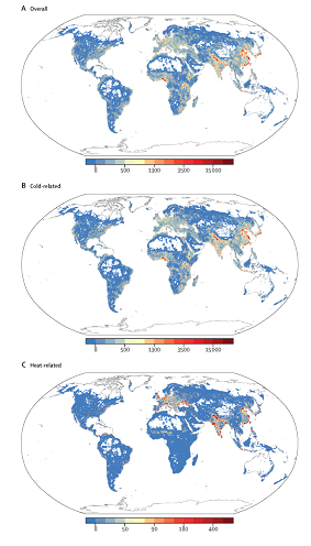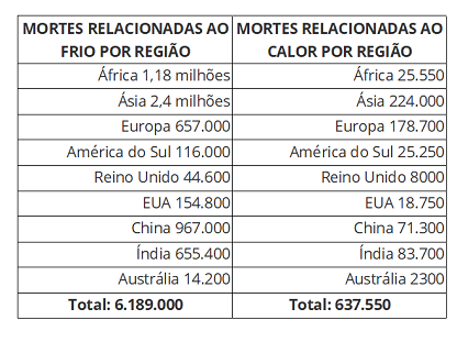 Globalmente, 5.083.173 mortes (95%) foram associadas a temperaturas não ideais por ano, consistindo em 4 594 098 mortes relacionadas ao frio e 489.075 mortes relacionadas ao calor. De todas as mortes em excesso, 51,49% ocorreram na Ásia, 23,88% ocorreram na África, 16,44% ocorreram na Europa, 7,70% ocorreram nas Américas e 0,48% ocorreram na Oceania. A maioria das grades com alta densidade de mortes em excesso estavam em grandes cidades costeiras baixas e lotadas no leste e sul da Ásia e cidades no leste e oeste da Europa.” ()