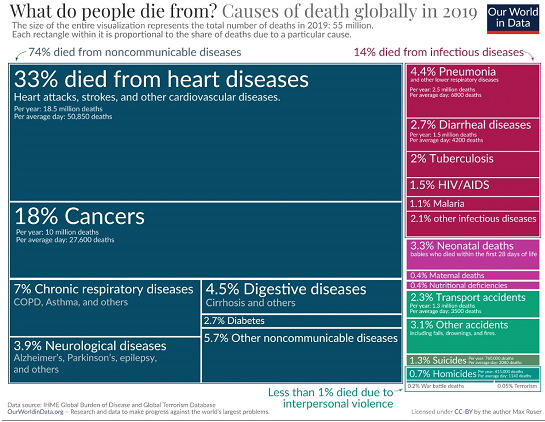 Aproximadamente 135 milhões de pessoas nascem por ano no mundo, enquanto cerca de 56 milhões morrem no mesmo período. As principais causas de morte incluem doenças cardiovasculares, câncer e outras doenças não transmissíveis, que juntas são responsáveis por 73% das mortes.