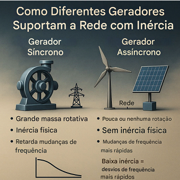 Têm grandes massas rotativas, fornecem inércia física; e - Ajudam a desacelerar as mudanças de frequência, dando tempo para os sistemas reagirem, seja pela demanda ou pela geração.