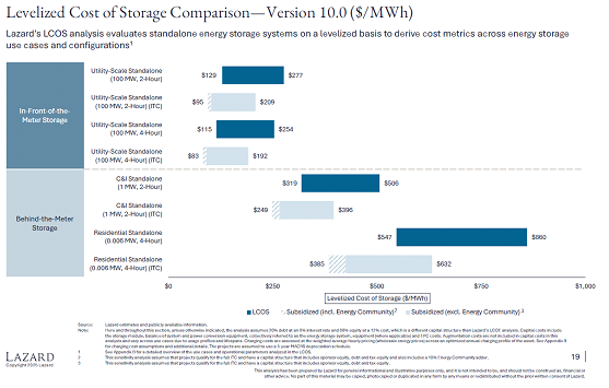 Porém o custo de baterias não é barato. Só para comparação a tarifa média no Brasil é de R$ 740,00/MWh (US$ 133,64/MWh) ()