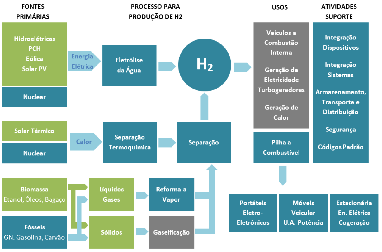 O hidrogênio pode ser obtido a partir de diversas matérias-primas e, também, de ocorrências naturais, através de variadas rotas tecnológicas. A Figura abaixo ilustra, simplificadamente, estas rotas desde a produção até o uso do hidrogênio.