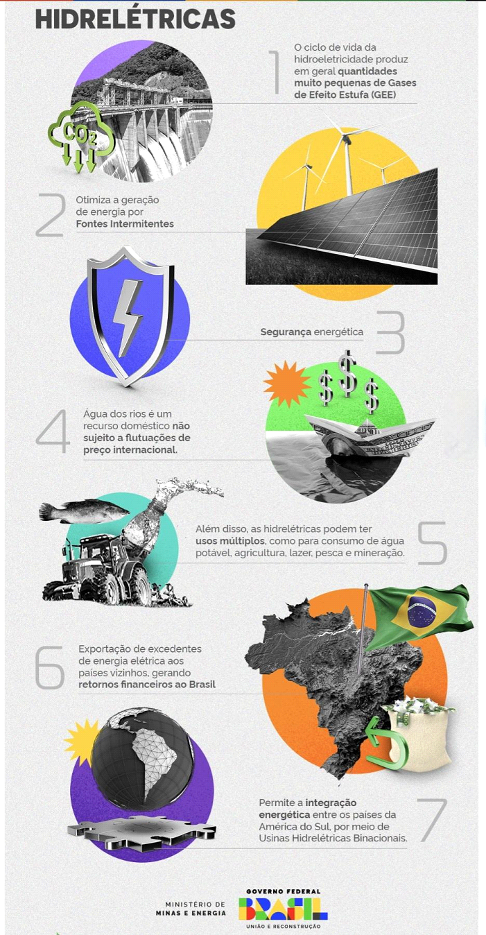 A imagem a seguir, elaborada pelo Ministério de Minas e Energia, apresenta os benefícios da Usinas Hidrelétricas.