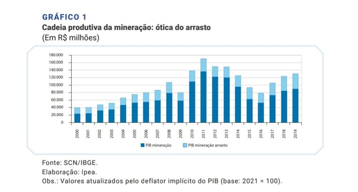 (1)LEÃO, Rafael; RABELO, Rodrigo. A Extensão da cadeia produtiva da economia mineral no PIB brasileiro. Rio de Janeiro : Ipea, dez. 2023. 88 p. : il. (Texto para Discussão, n. 2950). DOI: http://dx.doi.org/10.38116/td2950-port