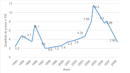 LAGARINHOS et al., 2009, fornece informações acerca da reciclagem e destinação de pneus inservíveis até 2008 e aborda a importação de pneus usados no Brasil. O Gráfico 1 apresenta um panorama detalhado da importação de pneus usados no Brasil entre 1993 e 2008, evidenciando variações significativas ao longo destes anos. Inicialmente, houve um crescimento considerável nas importações, atingindo seu pico em 2005 com 10,5 milhões de unidades importadas. Esse aumento inicial pode ser atribuído a condições econômicas favoráveis e à ausência de restrições regulatórias mais severas. A partir de 2006, no entanto, as importações começaram a declinar, o que se alinha com a implementação de legislações mais restritivas. A Resolução Conama nº 301/02, por exemplo, estabeleceu regras para a destinação final de pneus usados importados, enquanto a decisão do Supremo Tribunal Federal em 2009 proibiu completamente a importação de pneus usados de qualquer origem, refletindo um endurecimento das políticas ambientais e de saúde pública no Brasil. Talvez esta seja a justificativa para o fato de que é possível acessar pelos canais oficiais apenas os dados sobre o custo de importação dos pneus inservíveis importados até 2009, conforme o gráfico abaixo (LAGARINHOS, 2011).