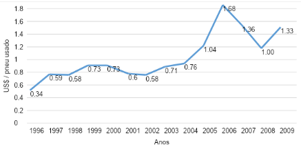 O gráfico 2 mostra os custos de importação de pneus usados no Brasil entre 1996 e 2009, em dólares. Inicialmente estáveis e baixos nos anos 90, aumentaram gradualmente a partir de 2000, atingindo picos em 2005 e 2007, com leve queda em 2008 e retomada em 2009. Essas variações refletem mudanças econômicas, regulatórias e cambiais, impactando diretamente os custos de importação de pneus usados no país.