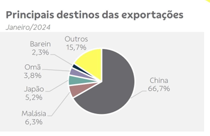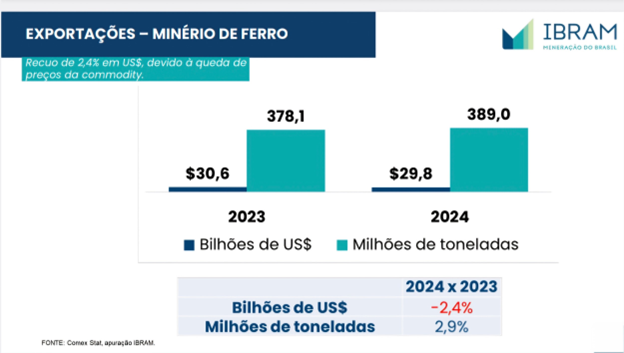 Exportações: cerca de 400 milhões de toneladas (+ 2,6% em relação a 2023) / Receita de US$ 43,4 bilhões (+ 0,9%). Minério de ferro = 68,7% das exportações.