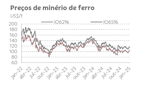 As importações de minério de ferro dispararam em dezembro para 112,5 Mt (10,4% m/m e o maior volume mensal desde julho/20), e, no ano de 2024, somaram 1.238 Mt (+4,9% a/a)”.