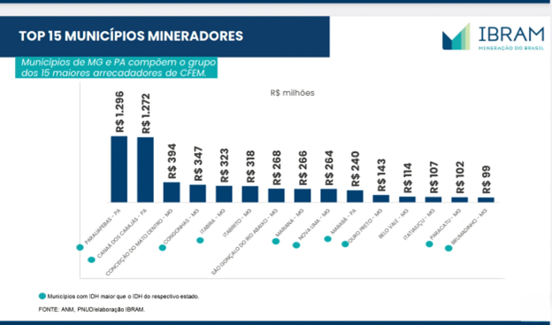 O quadro abaixo mostra o 15 maiores municípios mineradores que mais arrecadaram a CEFEM