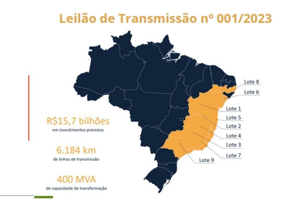 O 1º leilão de transmissão de energia elétrica de 2023, realizado em 30.jun.2023 pela Aneel (Agência Nacional de Energia Elétrica), terminou com 7 empresas vencedoras, sendo que os nove lotes ofertados foram vendidos, com 50,97% de deságio médio sobre as Receitas Anuais Previstas para os agentes vencedores gerando uma receita de R$ 15,7 bilhões em investimentos potencialmente captados para o setor elétrico brasileiro.