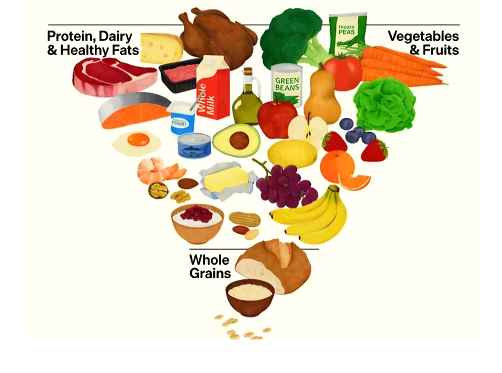 A nova pirâmide alimentar preconiza que a população deva comer mais alimentos integrais e proteínas, menos alimentos altamente processados e menos açúcar adicionado.