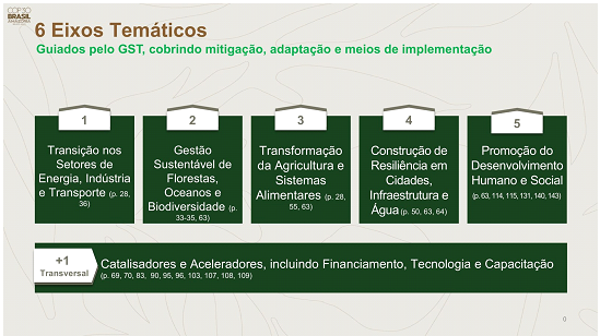 A Presidência da COP30 propõe traduzir os resultados do Balanço Global em seis grandes eixos temáticos e trinta objetivos-chave, que serão impulsionados por múltiplas soluções.
