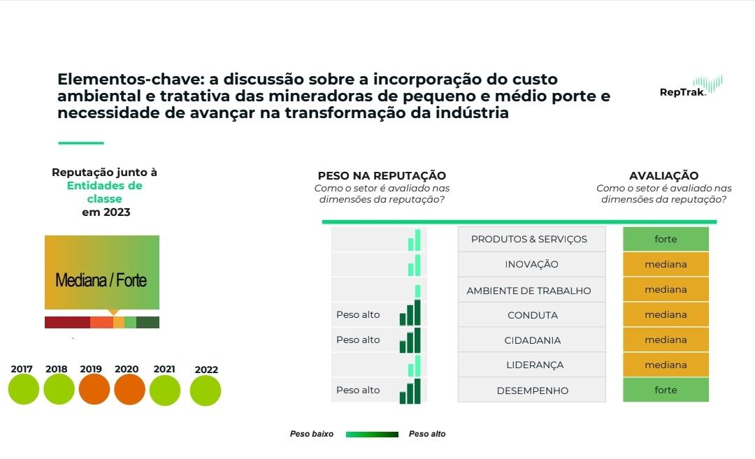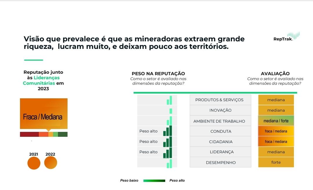 A percepção do setor pela sociedade vem sendo acompanhada de perto por uma iniciativa do Instituto Brasileiro de Mineração- IBRAM, que realiza anualmente um estudo, junto com a empresa especializada RepTrak TEAM, cujos dados mais recentes foram apresentados à sociedade no mês de junho de 2023.