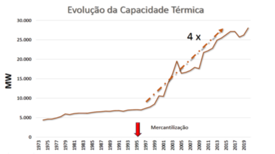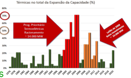 Nele destaca-se que em 2004 e 2005, em barras vermelhas, devido ao racionamento e ao PPT, a expansão da capacidade total do sistema ocorreu em mais de 70% por meio de termelétricas fósseis e, em 2010, depois do leilão de 2008, essa expansão por térmicas, em barras laranja, chegou a 48%. Um aumento para lá de suspeito, quando se considera que ter existido um proposital bloqueio à construção de novas hidrelétricas.
