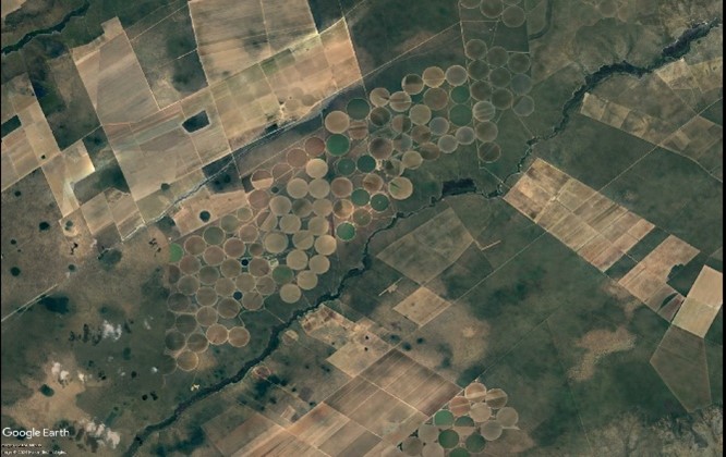 A foto de cima é a original da matéria de anteontem da CNN, que pode ser acessada nesse link. É pena que, aqueles que apenas olharem a foto e só lerem a manchete, poderão pensar que culpa da queda do nível dos aquíferos é dos pequenos agricultores, que usam sistemas quase artesanais como o da imagem. E não os grandes projetos como os da foto da direita, com centenas de pivôs centrais. reservas subterrâneas